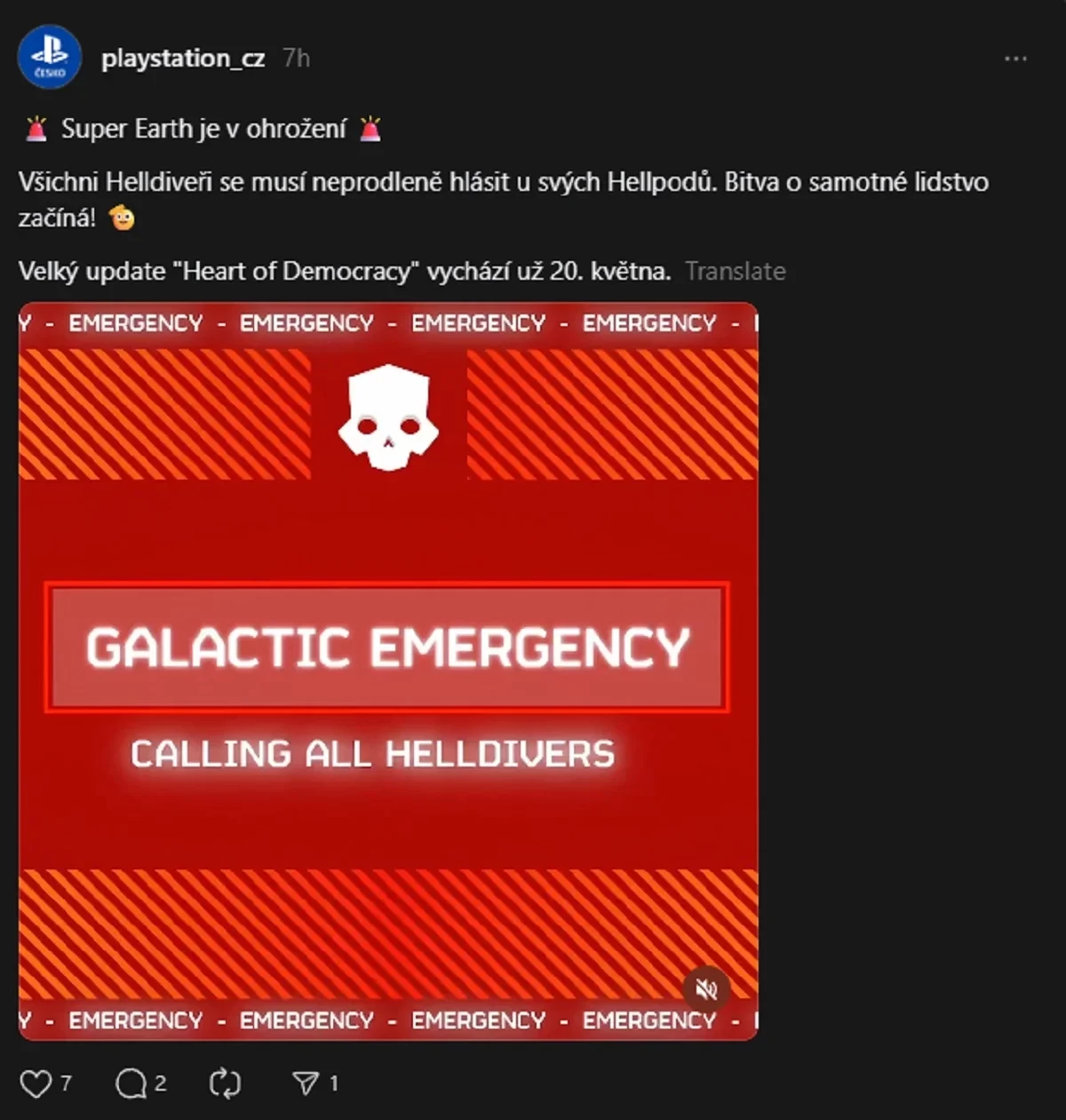 4 фотоНо, похоже, это ещё не всё. Официальный чешский аккаунт PlayStation опубликовал в соцсетях информацию о грядущем обновлении для Helldivers 2 — Heart of Democracy — с релизом 20 мая.