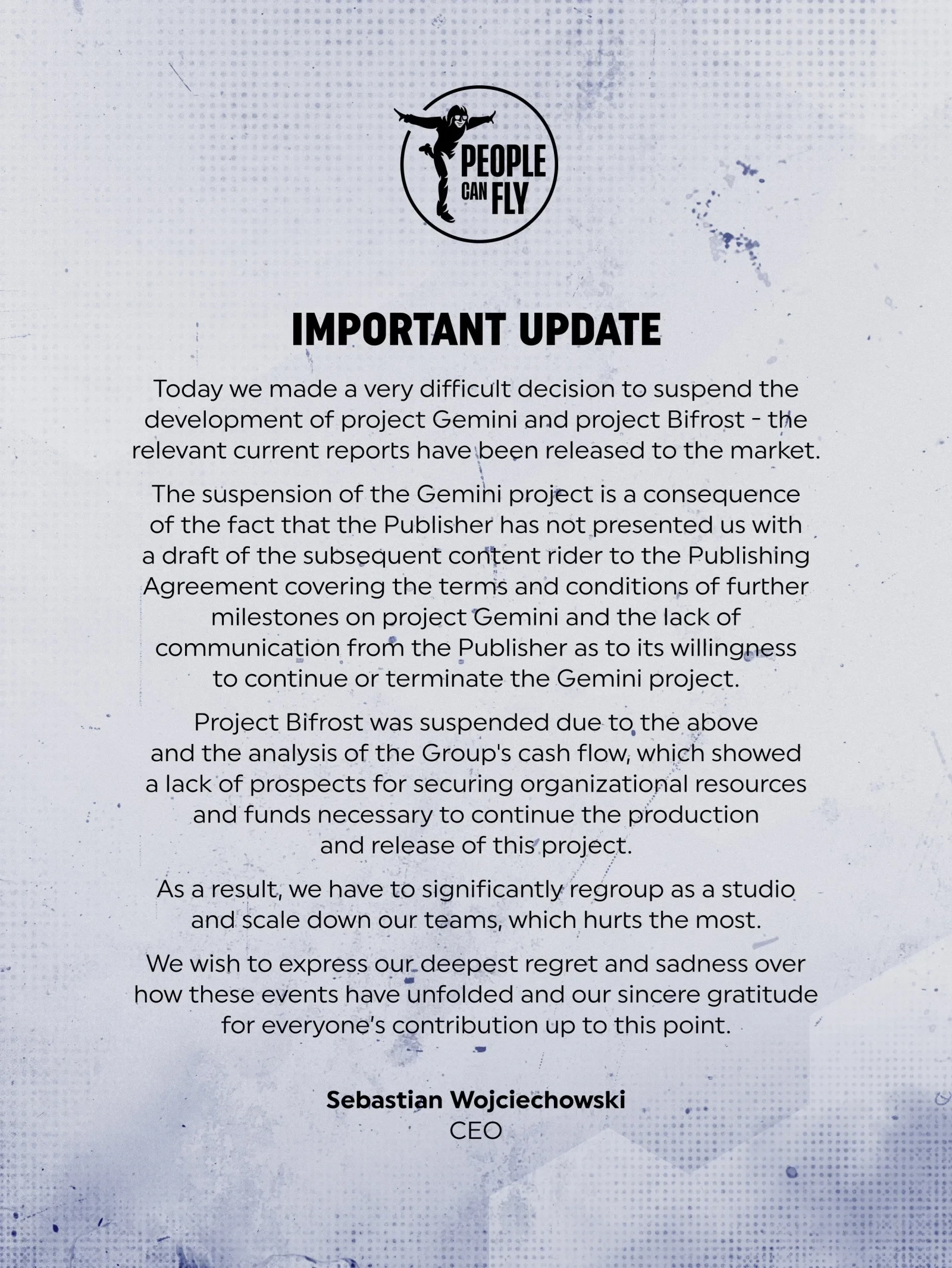 Вследствие всего вышеперечисленного People Can Fly будет вынуждена уволить ещё больше специалистов. И, как говорит глава компании, это «ранит сильнее всего».