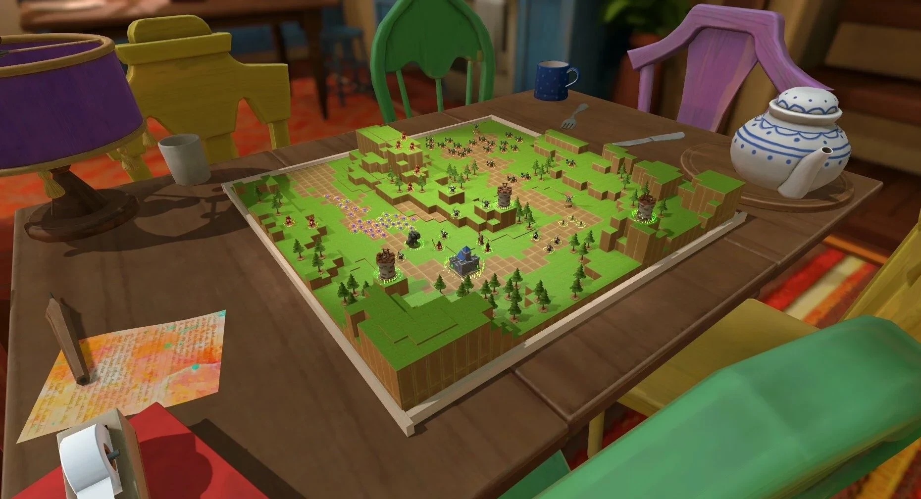 Table Tactics заявлена как пошаговая стратегическая игра, но в её основе лежит игровая физика. Фигурки нападающих мы должны любыми способами сбить со стола, так что никакие очки здоровья и характеристики для них не предусмотрены — учитывается лишь форма и вес.