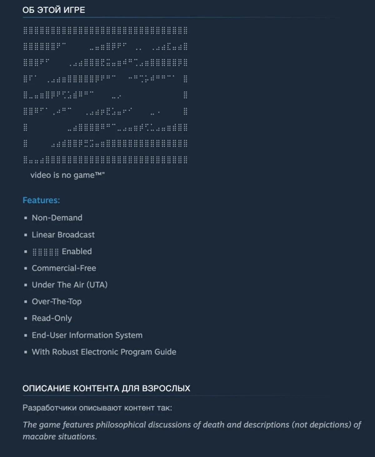 Описание игры в Steam не добавило ясности о природе грядущего проекта — там упоминают, что у Blippo+ будет «линейное вещание» без «рекламы», а программы доступны для всех желающих. Кроме того, упоминается некое электронное руководство.