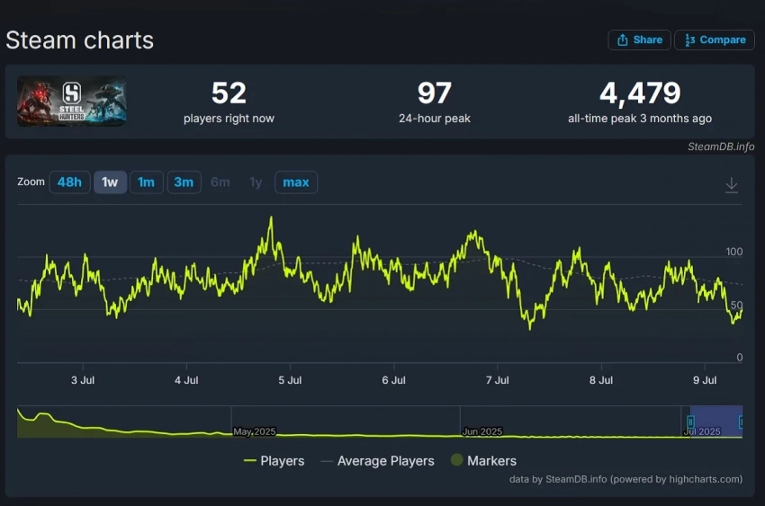 Она находится в раннем доступе Steam с апреля этого года. Пиковый онлайн составил 4 479 игроков одновременно. В мае — 651 человек. А затем всё ниже и ниже. Пиковый онлайн за последние сутки — всего 97 игроков одновременно.