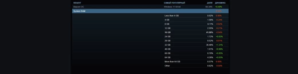 16 ГБ оперативной памяти — классика, которой может похвастаться 41,88% пользователей Steam. Однако в августе число игроков с этим объёмом памяти уменьшилось, тогда как варианты систем с 24 ГБ (+0,03%), 32 ГБ (+1,31%), 48 ГБ (+0,06%), 60 ГБ (+0,05%:) и 64 ГБ (+0,03%) стали слегка популярнее. Все объёмы оперативной памяти менее 24 ГБ показывают небольшое снижение.